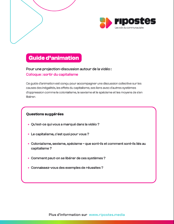Un guide d’animation a été conçu pour accompagner les personnes souhaitant organiser une activité de projection-discussion autour de cette vidéo. Le guide propose des questions visant à encourager les échanges entre les participants et à approfondir les sujets abordés dans la vidéo.