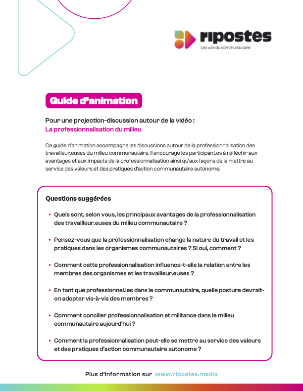 Un guide d’animation a été conçu pour accompagner les personnes souhaitant organiser une activité de projection-discussion autour de cette vidéo. Le guide propose des questions visant à encourager les échanges entre les participants et à approfondir les sujets abordés dans la vidéo.