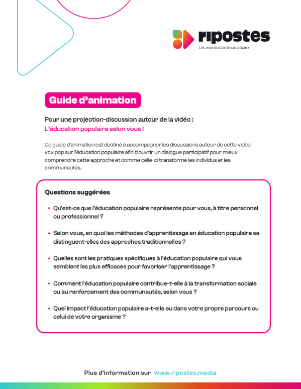 Un guide d’animation a été conçu pour accompagner les personnes souhaitant organiser une activité de projection-discussion autour de cette vidéo. Le guide propose des questions visant à encourager les échanges entre les participants et à approfondir les sujets abordés dans la vidéo.